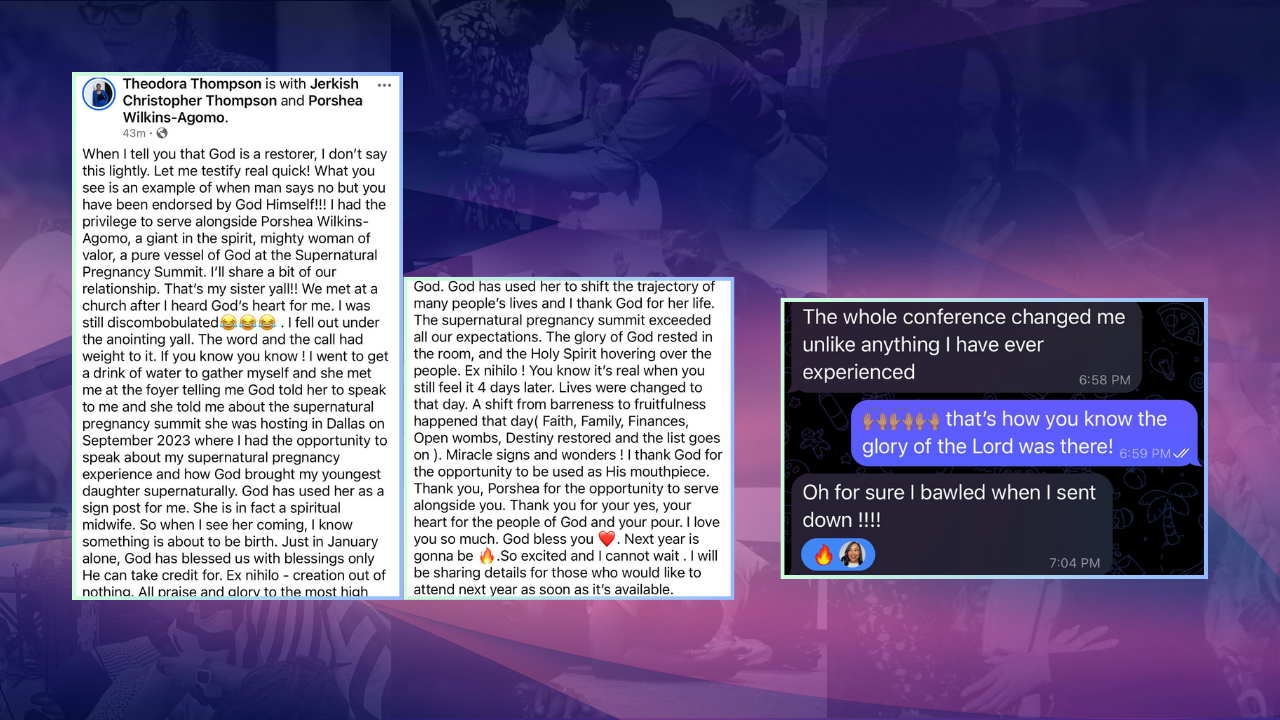 He kept His promise and gave us our son Aiden Nkwachi (God’s Promise) Wilkins-Agomo on my 39th birthday in 2020. In 2022, I started traveling and hosting the Supernatural Pregnancy Summit to continue to serve as a purpose Midwife to others who were believing for birthing babies and other promises in their lives overall.